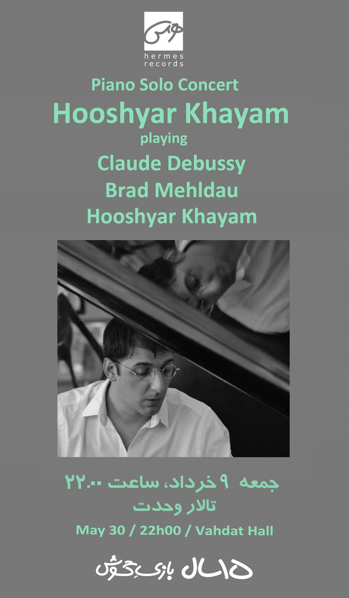تكنوازي پيانو «هوشيار خيام» با همكاري نشر هرمس 9 خرداد در تالار وحدت برگزار ميشود.